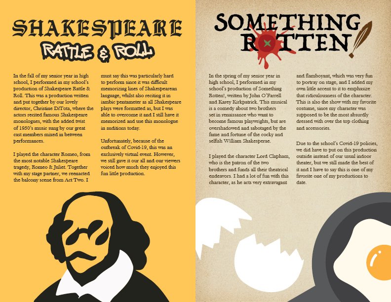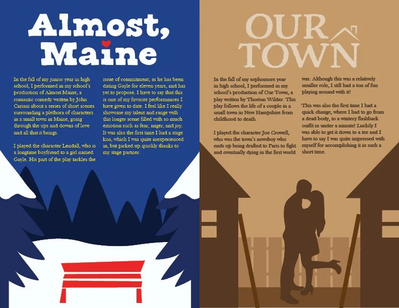 Outside of art and design, I quite enjoy participating in acting and theater. From as early as middle school, I have been known to be on stage with almost any production that my schools put on. It is an integral part of my past and who I am as a person, and I wanted to make a commemoration to all that in a personally designed booklet.
