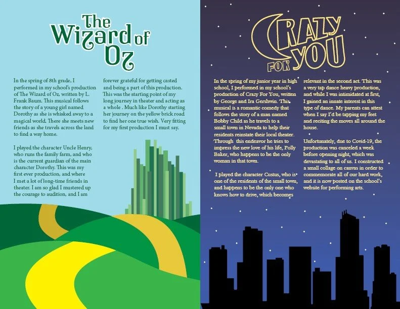 I challenged myself to create a short zine in the style of a Playbill that included notable information about every each production such as The character I played, the year it premiered, and my personal experience through it all. In addition that that I wanted to go the extra mile and create my own original logos and graphics for each of these shows by portraying their main themes and plot points.