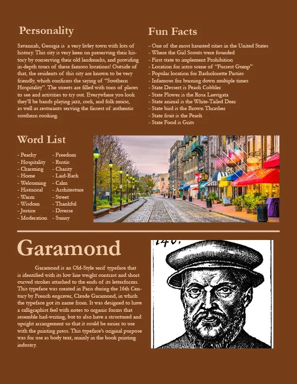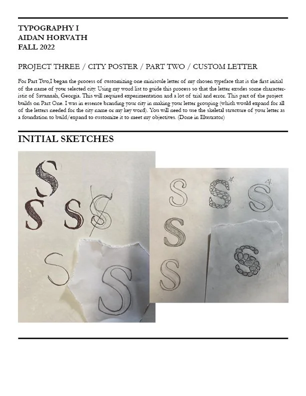 I was tasked to create a simple monotone poster that that encompassed the aesthetics and characterizations of Savannah, Georgia in one simple and visually appealing piece. This will be used to advertise the city and be viewed by potential tourists. In addition to this, I was asked to create a custom letterform based on the city’s first letter “S” to include onto the poster as an additional decorative element to the poster to boost its visual appeal.
